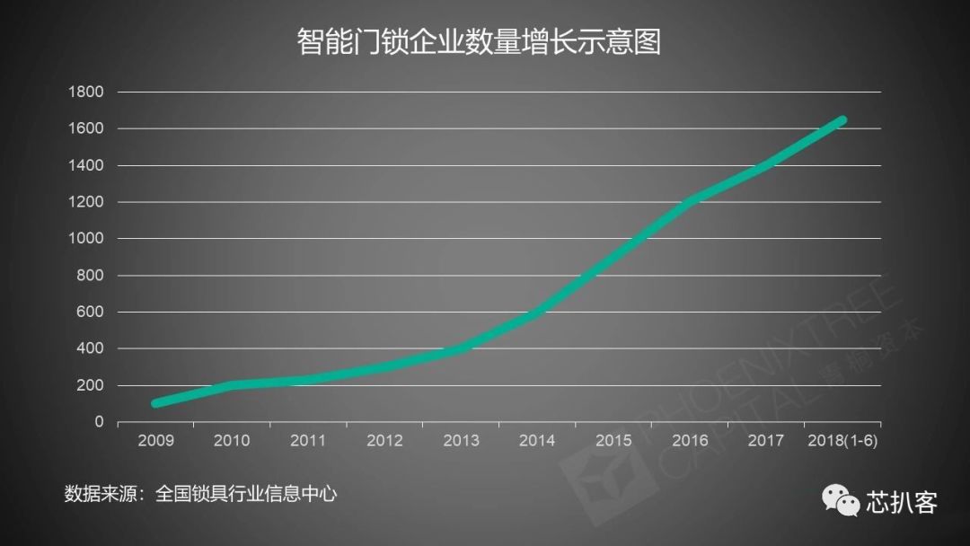 智能门锁从2015年步入发展的快车道,市场总销量以每年平均近100%的速度在增长,到2018年家庭端销量突破1000万套,有1500多家企业进入智能门锁领域,这个行业正快速走向繁荣期。