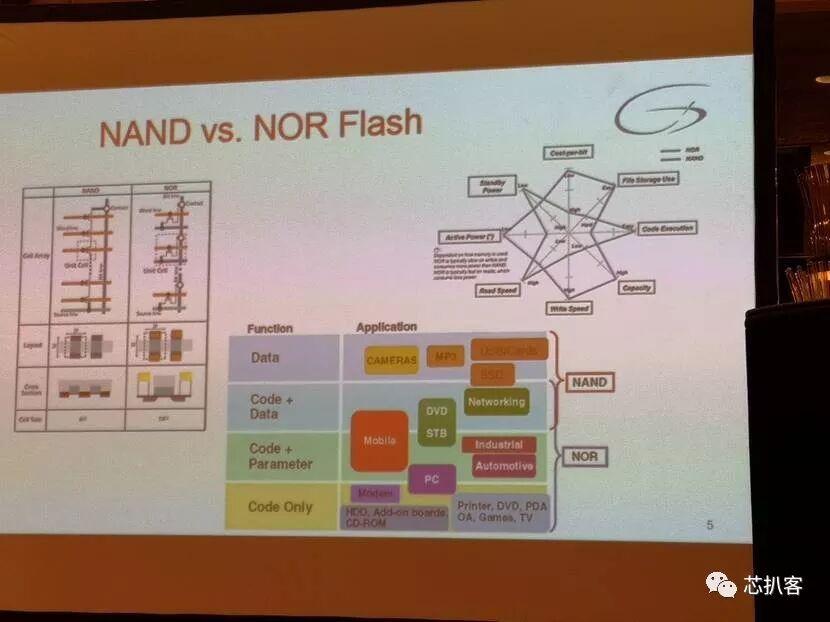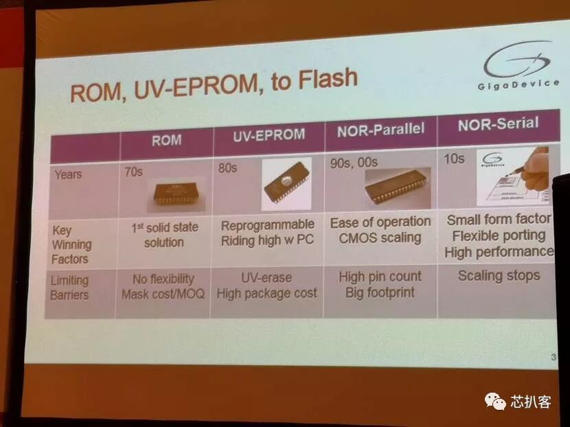 70年代必须让所有程序存储大量的信息和材料,不可进行擦除操作,ROM凭借第一代固态解决方案取得了关键性优势,但其主要受无柔性掩膜和成本的限制;到了80年代,出现了可擦除的UV-EPROM,第一台PC有窗口,因为需要拿出来并放在UV光下,以便带走存储在栅介质中的电子。一旦具备可擦写的编程,便是一个巨大的成功。技术的演变方式是先有应用程序,然后就会有问题需要解决,最后提供适合之前解决方案的技术和解决方案,这就是UV光可擦除问题在十年内取得成功的原因。 到了10年推出了NOR-Serial产品,凭借其小巧柔性的外形和高性能赢得了市场,但受到scaling stop的限制。