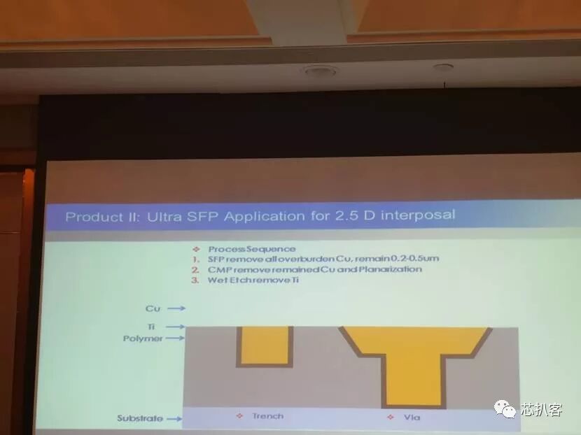 抛光新产品主要是用在先进封装,未来5G技术和AI芯片快速发展,对于数据传输要求比较高,目前TSV 3D 良率较低成本较高,2.5D在现在乃至未来是更好解决方案,所以AI技术所带来的高密度的封装和数据传输将会是一个爆发点,目前系统封装就需要这个技术,台积电的话要看他怎么做,目前认为新技术的发展驱使下,未来将对电镀以及抛光设备有更多的需求。因为线宽要镀五微米以上,要用CMP作的话,最大的问题就是一个抛光粉成本较高,还有同时抛光的镀层也比较厚也要花费很长时间,这两块的费用都会非常高,大约20到30美金。除非目前抛光液可以国产化,才可能降低一点成本。但是最核心的就是CMP的抛光液不能重复使用,因为里面有颗粒,如果重复使用就会在表面产生划痕使得产品报废,这就会造成高成本,同时CMP的废弃抛光液进行处理时也较麻烦,首先要去除里面的金属然后再打包埋入地下。