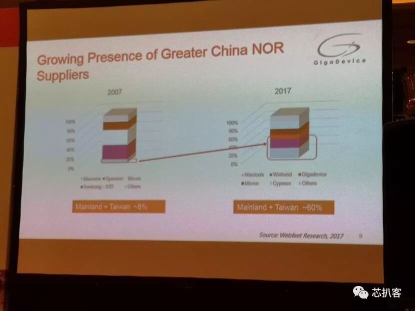 越来越多的NOR Flash中国供应商涌现。中国大陆和台湾NOR Flash供应商由2007年的8%,提升至2017年的60%。