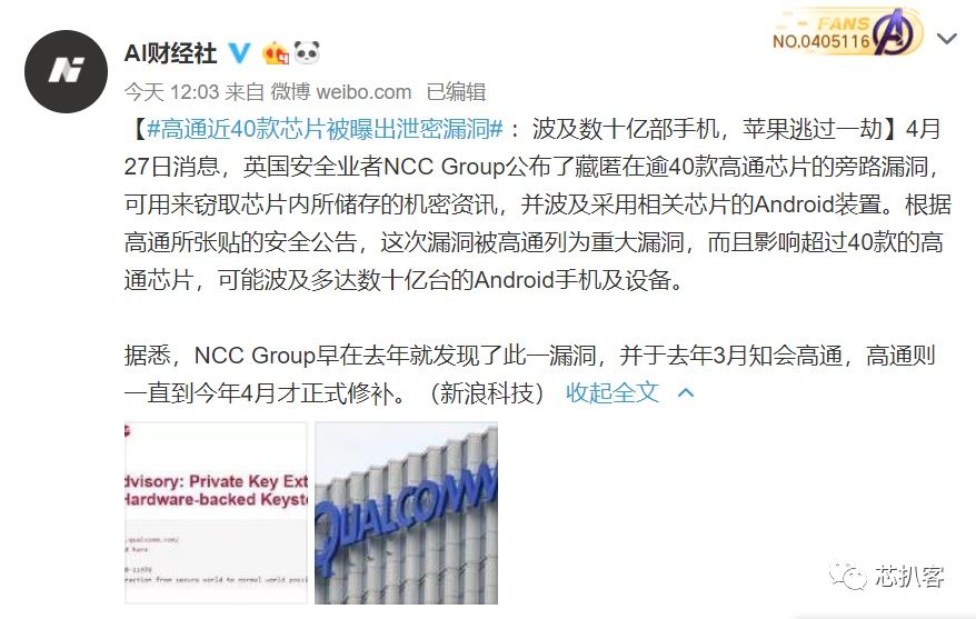 近日,英国安全者NCC Group公布了“藏匿在逾40款高通芯片的旁路漏洞,可用来窃取芯片内所存储的机密资讯”后,高通在本月初修复了这一去年就得知的漏洞,根据高通安全公告,这一漏洞属于ECDSA签章代码的加密问题,被高通列为重大漏洞,波及多达数亿台的Android手机及设备。