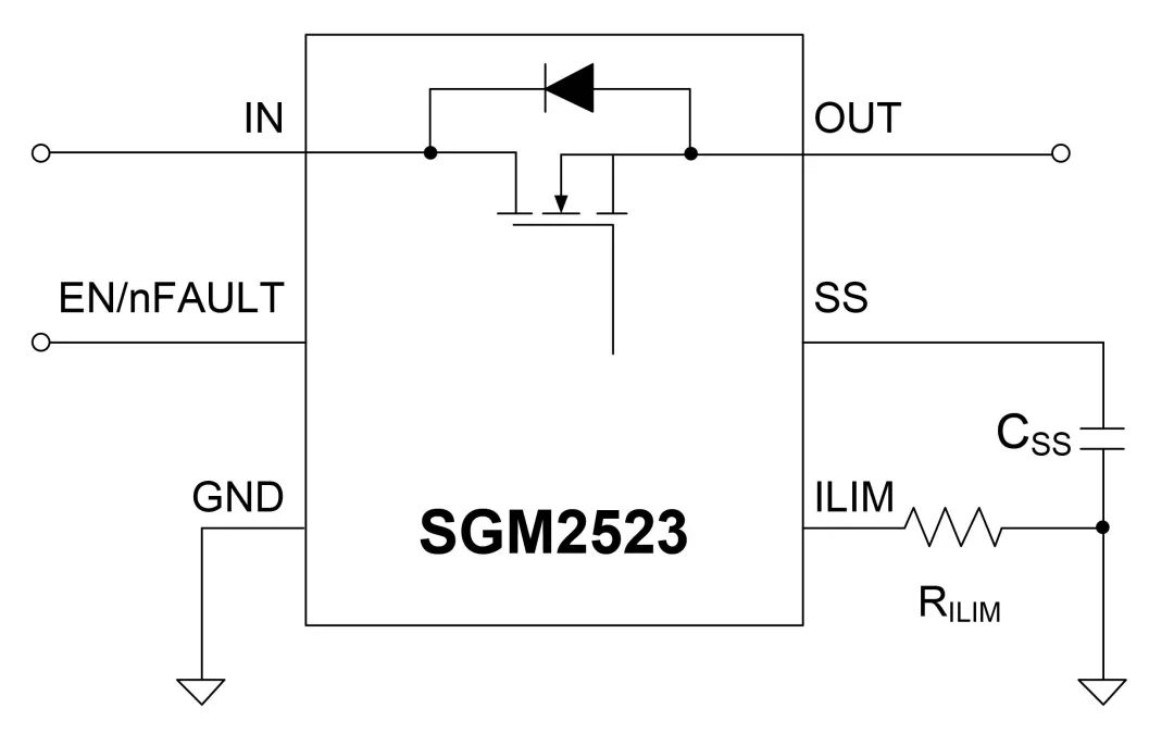 SGM2523是一款具有欠压保护、过热保护及短路保护功能,外形紧凑、功能丰富的eFuse可编程限流开关。采用绿色环保型SOT-23-6封装,工作温度范围为-40℃至+125℃,2.5V到24V的宽输入电压允许控制5V及12V等通用DC总线,可承受30V的浪涌电压。室温条件下,±10%内的限流精度能够确保SGM2523向多种系统提供电路保护,避免由于输出电流的意外短路和瞬变给输入电流造成影响。可编程的缓起电路可以减小输入端的浪涌电流、降低启动过程中输出电容充电及负载电流对输入电源的冲击,并且通过配置合适容值的软启动SS电容,在有限的限流设定下使带载容性负载达到1000μF。