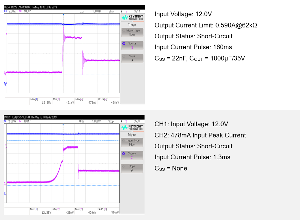 表1显示了SGM2523评估板在输入电压/电流、输出电流限值0.590A@62kΩ时的短路保护测试数据。