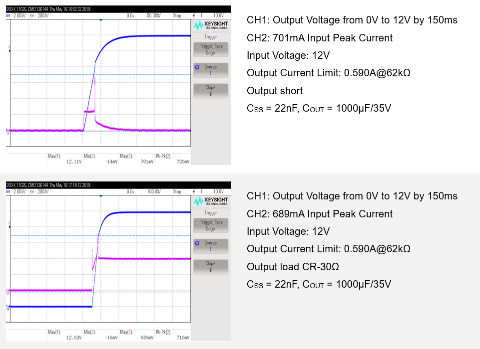 表2左右分别显示了SGM2523评估板加载1000μF输出电容短路启动和加载1000μF输出电容同时加载电子负载(CR-30Ω)软启动的测试数据。